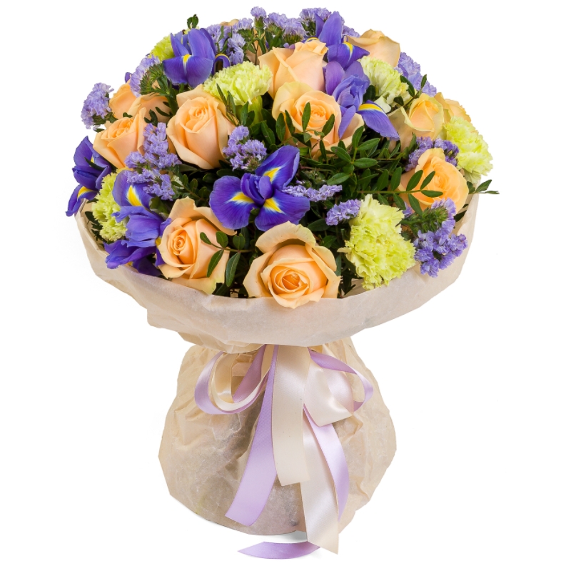 Букет состоит из 11 кремовых роз, 7 гвоздик, 7 ирисов, 6 статица, зелень, крафт, атласная лента.