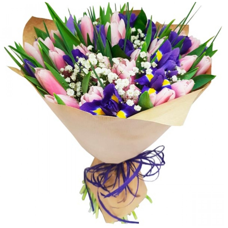 Букет состоит из 25 розовых тюльпана, 16 ирисов, 3 ветки гипсофилы, крафт, атласная лента.