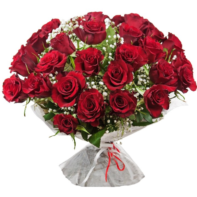 Букет состоит из 31 красная роза, 7 гипсофила, красивая упаковка, атласная лента.