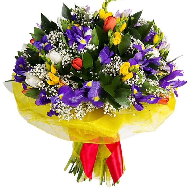 Букет состоит из 15 ирисов, 14 тюльпанов, 7 фрезий, 5 веток гипсофилы, зелень, красивая упаковка, атласная лента.