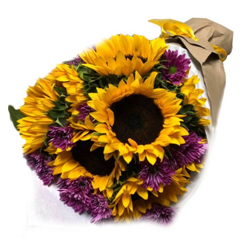Букет состоит из 9 подсолнухов, 6 веток сиреневой хризантемы, крафт, атласная лента.