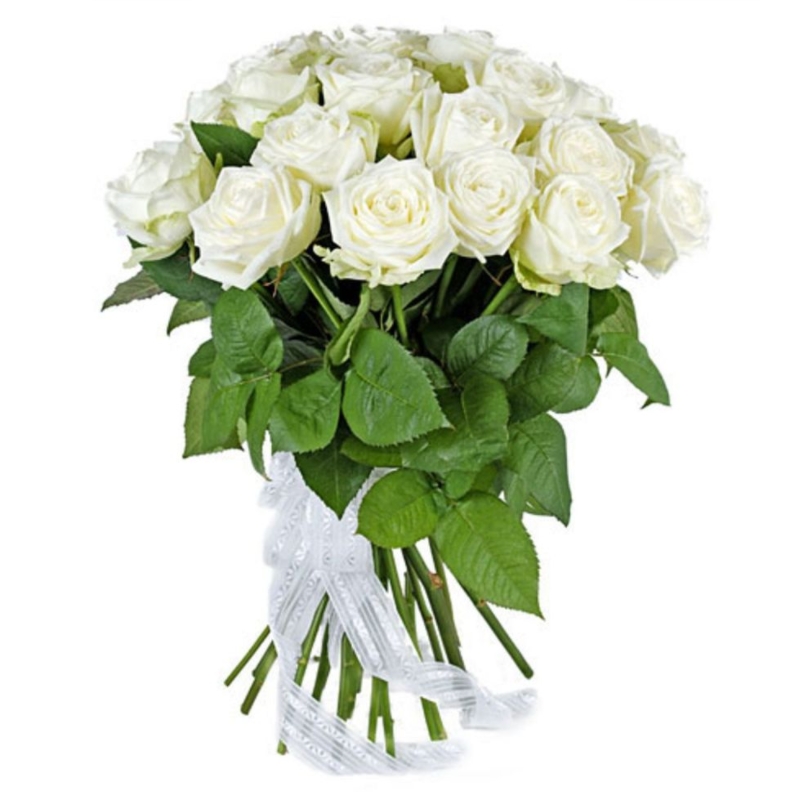 Букет состоит из 19 белых роз, прозрачная упаковка, атласная лента.
