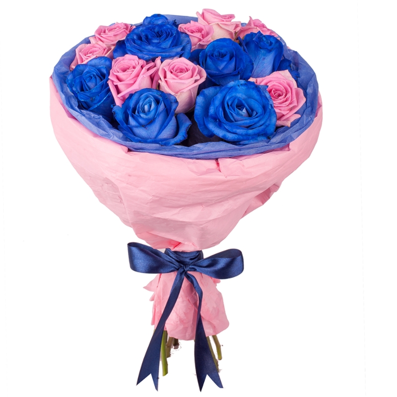 Букет состоит из 8 розовых роз, 7 синих роз, красивая упаковка, атласная лента.
